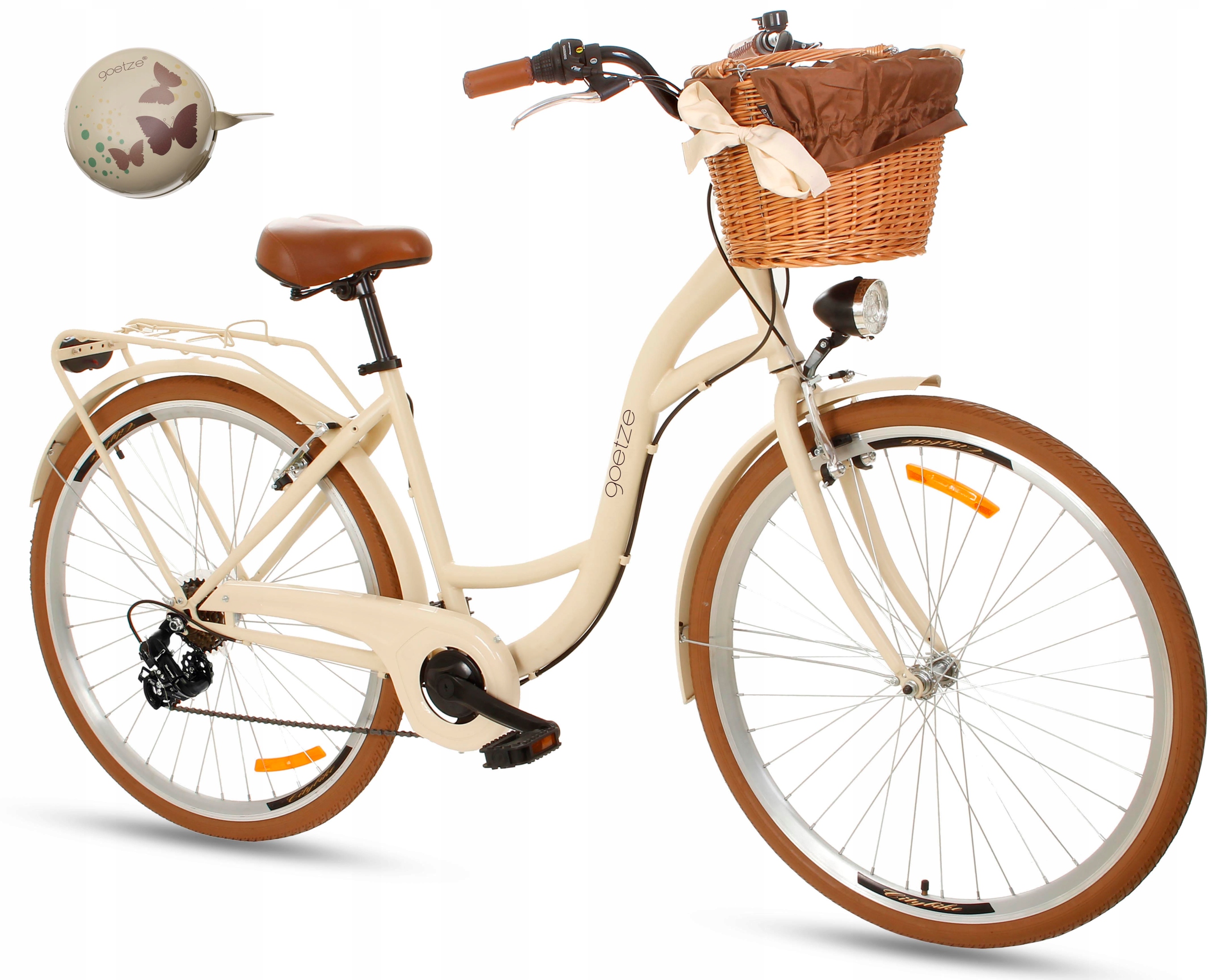 UWAGA: w tej ofercie do zakupionego roweru poza wiklinowym koszem z wkładem otrzymasz duży stylowy dzwonek Goetze o średnicy 80mm, świetnie pasujący do charakteru roweru.